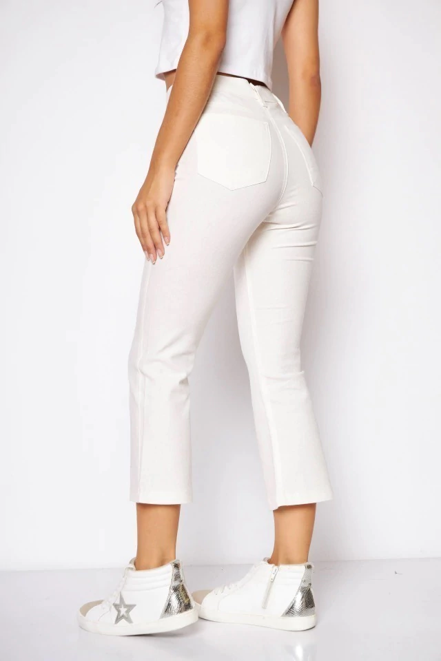 Pantalon de lino spandex, con pasadores en toda su cintura, con boton de carey y cierre a tono en su delantero para ingresar, con bolsillos tipo jeaneros redondos, en sus laterales y bolsillo relojero; tambien con dos bolsillos traseros aplicados; de corte ajustado al cuerpo y con un pequeño acampanamiento en su parte inferior. Sumamente original y comodo para que quieras usar a diario.