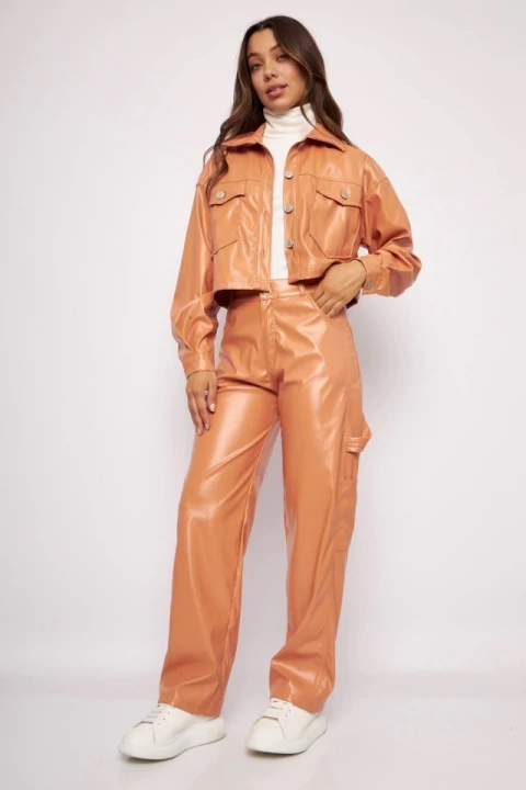 Pantalón de simil cuerina satinado tiro alto con costuras a contratono, presillas en el recorrido de la cintura y bolsillos plaque en los laterales tipo cargo; Ideal para un buen outfit para salir a bailar! El largo es aproximadamente hasta debajo del tobillo. Lo podes llevar tiro alto con un cinto o suelto a la cadera tipo tiro bajo.