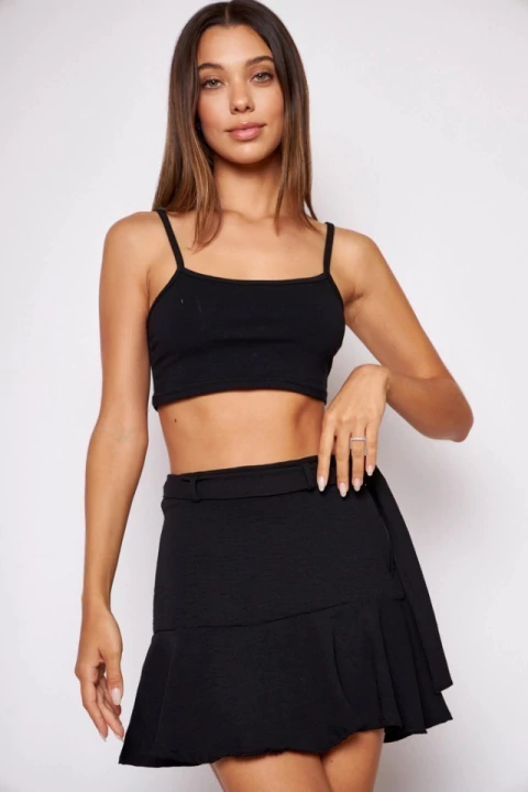 Pollera de crepe lino, con cierre invisible a tono en su lateral izquierdo, pasadores alrededor de toda su cintura, y lazo de tela para ajustar, pequeños volados en su parte inferior, de corte holgado, y de largo hasta aproximadamente mitad de muslo. Fresca y cómoda, vas a querer usarla todo el tiempo.